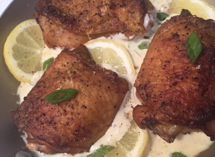 Directions: 1. Preheat oven to 375 degrees. 2. Clean chicken thighs to remove the fat from the bottom and edges. 3. Season chicken to taste using lemon pepper seasoning and/or salt, pepper, and seasoning salt. 4. Place the chicken on a cooling rack and place the cooling rack on top of a cookie sheet. (This will help the chicken crisp in the oven and not cook in it’s own juices.) Cook for 50 minutes or until brown and crispy. 5. In a skillet pan, mix in the heavy cream, chicken broth, and fresh squeezed lemons. Add seasonings to taste. 6. Cook on a medium temperature while whisking until thick. 7. Once the cream has thickened, place the chicken on top.