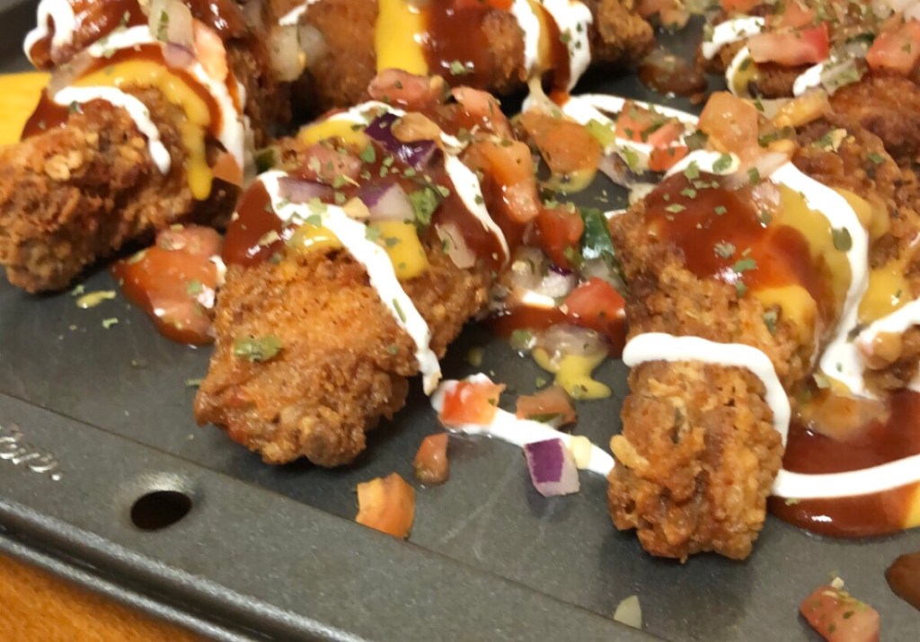 Nachos… great. But let’s replace the meat and chips with wings. Wings breaded and seasoned with taco seasoning.