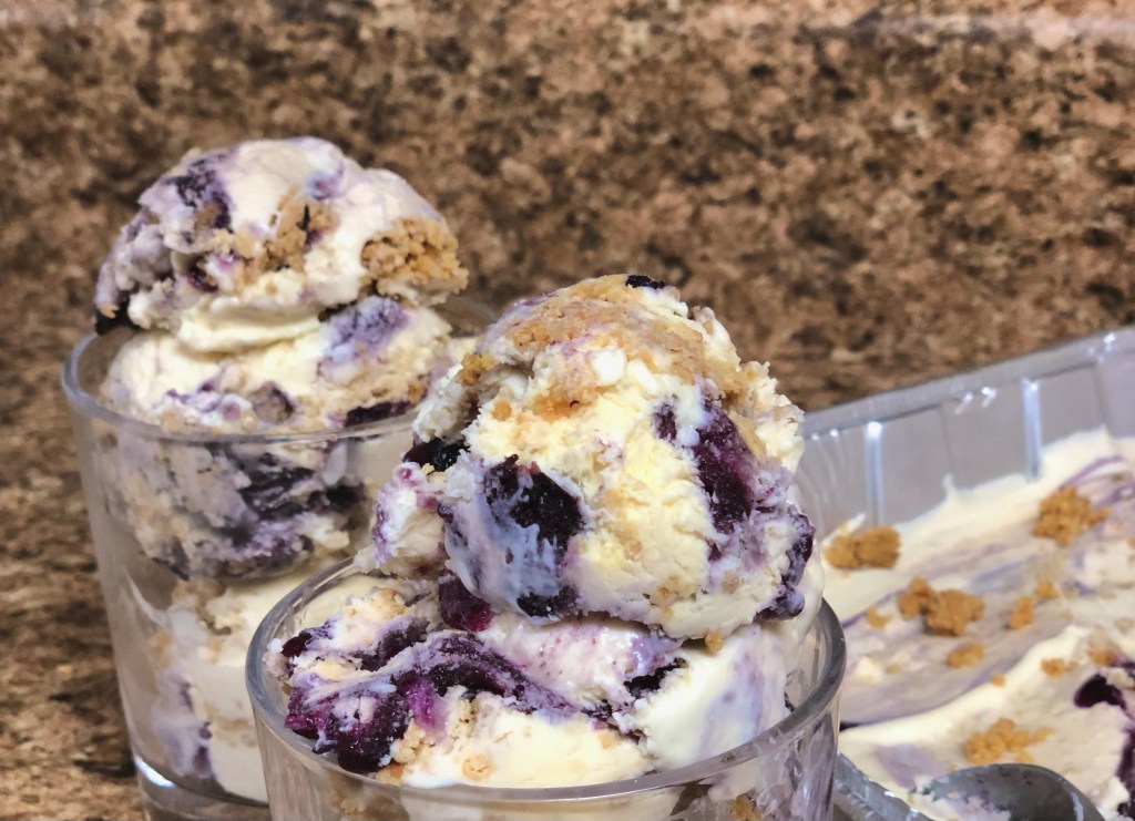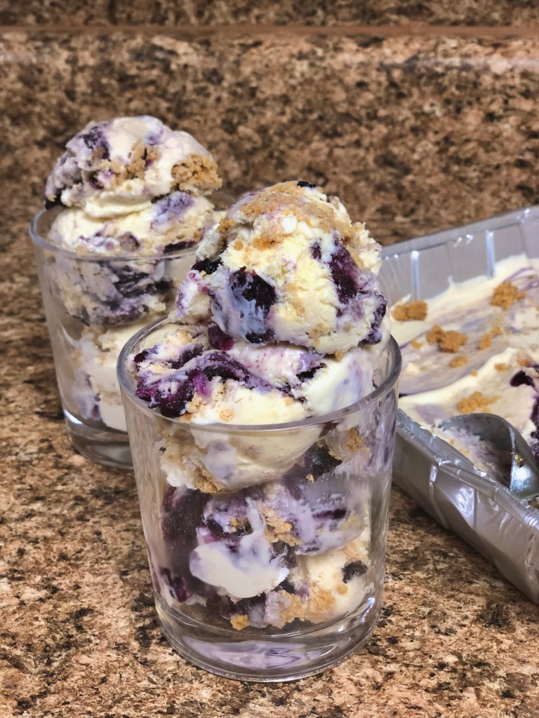 - Place the ice cream mixture, blueberry topping, and graham cracker crust mix into a pan. Freeze for 4-6 hours.