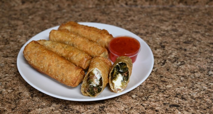Since then, I’ve been making my own version at home. Whenever I have leftover collard greens, this is one of my favorite ways to give them new life. Instead of letting good greens go to waste, I wrap them up in egg roll wrappers, add a little cream cheese for richness, and fry them until they’re perfectly golden and crispy.